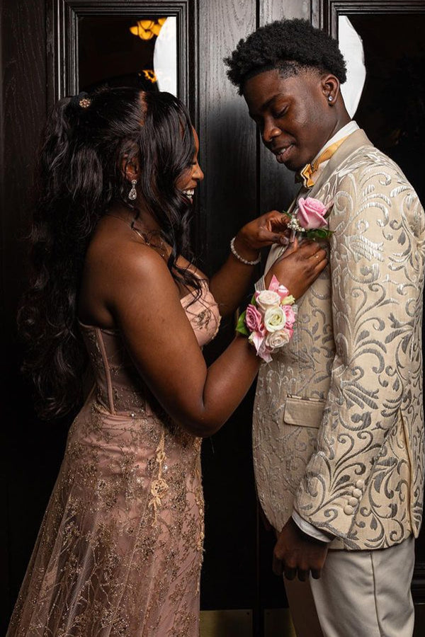 This elegant prom dress features a special design of delicate appliques, adding a touch of charm to the classic sweetheart neckline. Made with high-quality lace, it boasts a flattering sheath silhouette and a playful, yet tasteful, style. The sleeveless design and sweep train hemline make it perfect for a night of dancing.