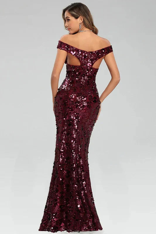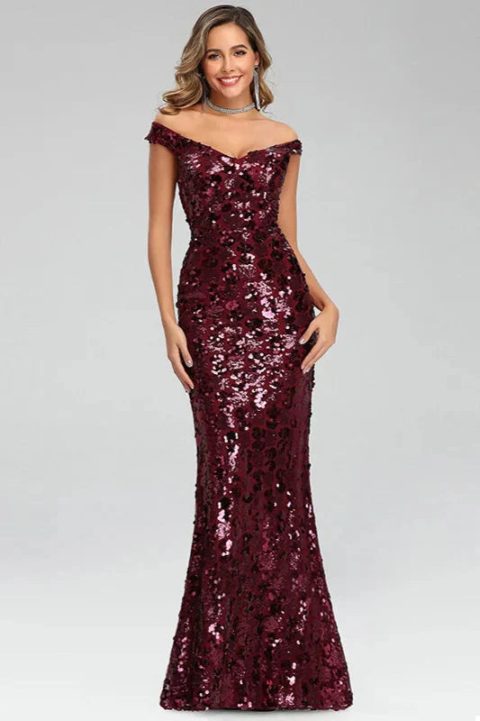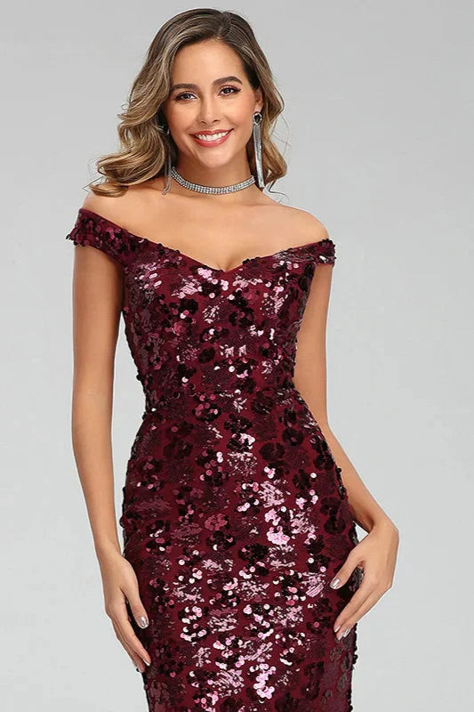 Off-the-Shoulder Burgundy Seuqins Prom Dress Long Mermaid Evening Party Gowns