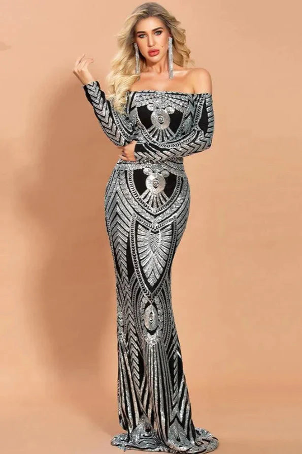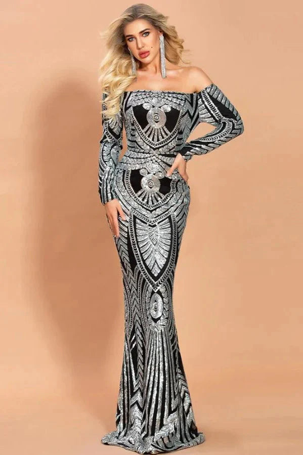 Off-the-Shoulder Long Sleeve Prom Dress Mermaid Sequins Evening Gowns