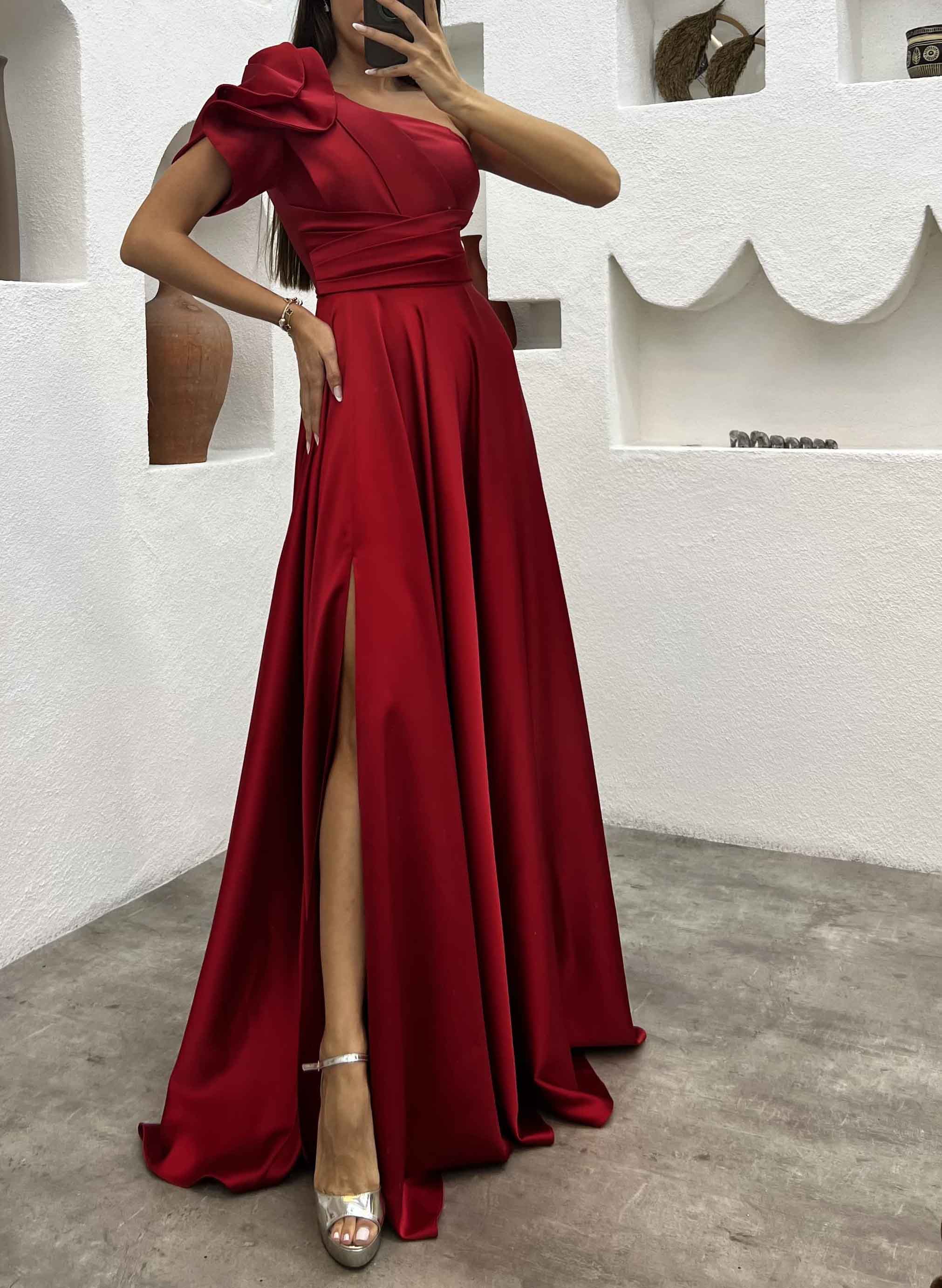 One Shoulder A Line Satin Bridesmaid Dress With Ruffle Short Sleeves Sweep Train Elegant Evening Dress