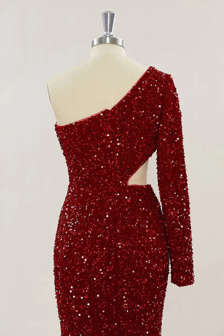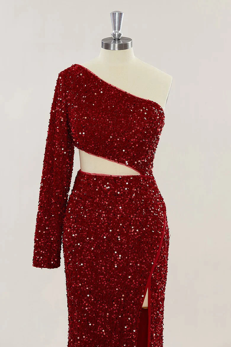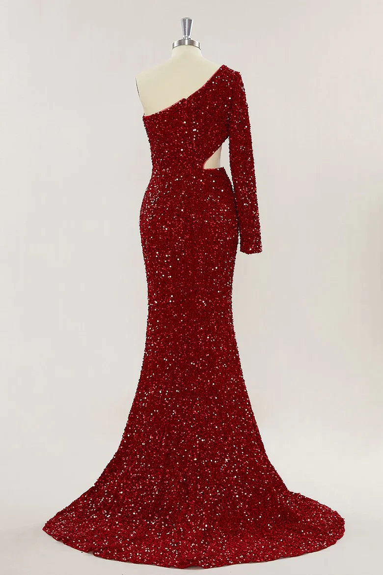 The One Shoulder Sequins Burgundy Prom Dress Long Evening Dress is a luxurious piece crafted from delicate sequins, fit to flatter the figure and make a statement. Designed with an alluring one shoulder silhouette, this timeless look is perfect for a formal occasion. Slip on this exquisite garment and enjoy its elegant, sparkling appeal.
