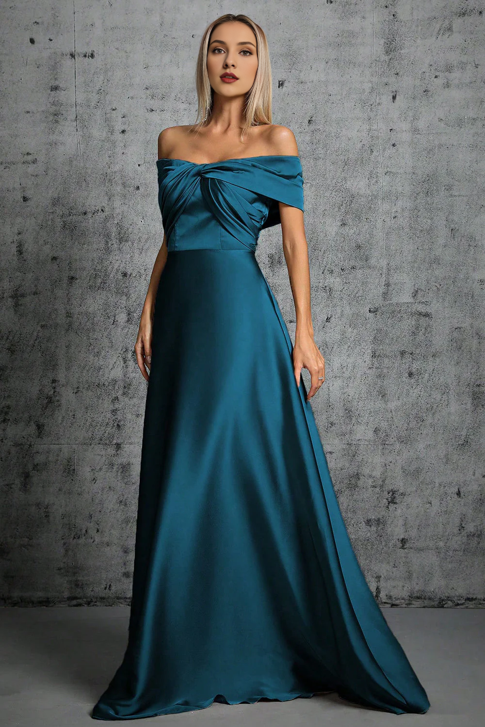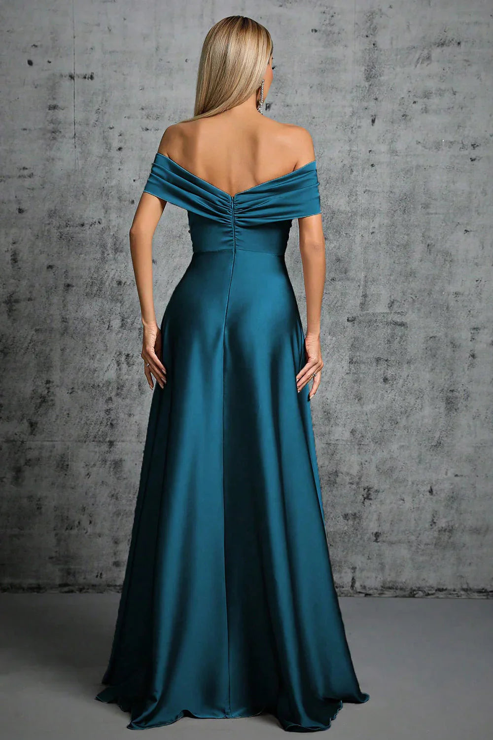 Peacock blue satin off shoulder pleated formal dress