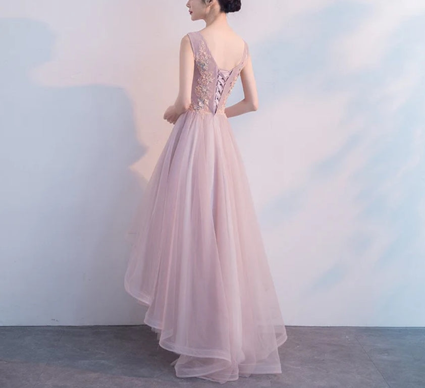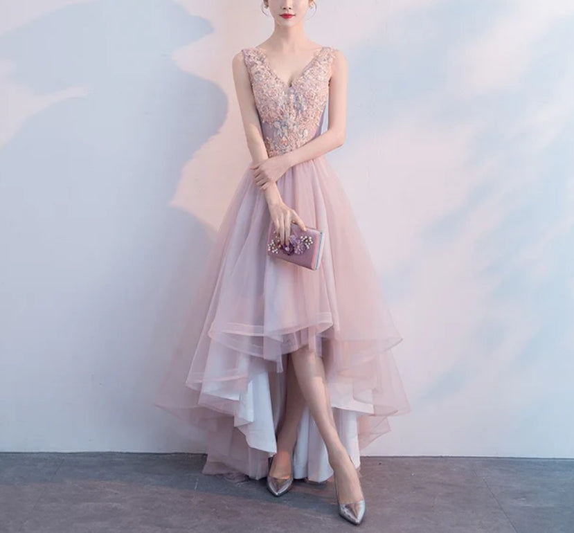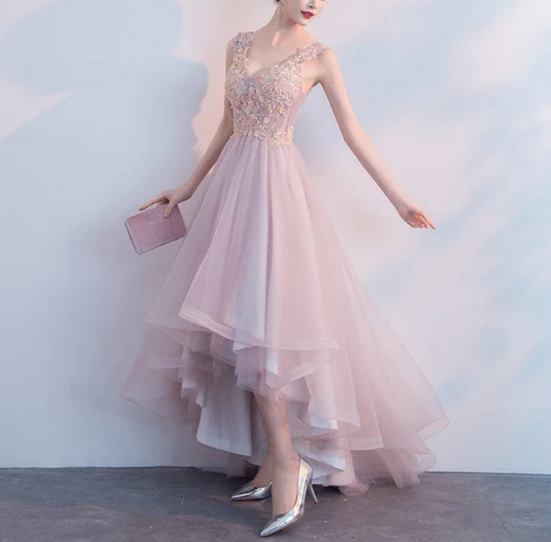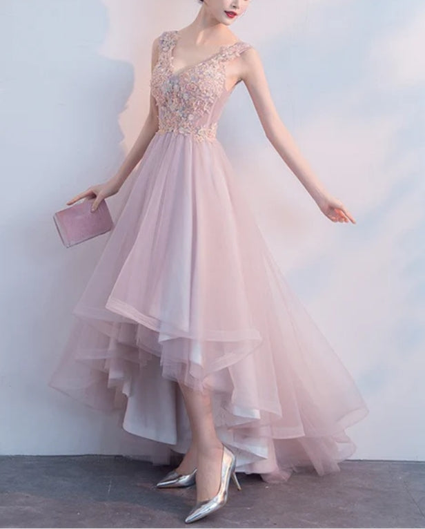 Pink V-neckline High Low Formal Dress Lace Applique Homecoming Dress