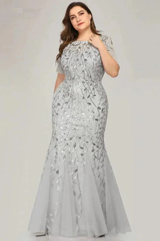 Women's Elegant Illusion Short Sleeve Crew Neck Sequin Embroidery Mermaid Evening Dresses - Gold