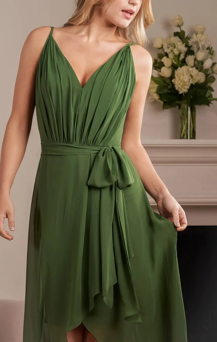 Polyester chiffon A-line thin shoulder strap bow back V-shaped bridesmaid dress