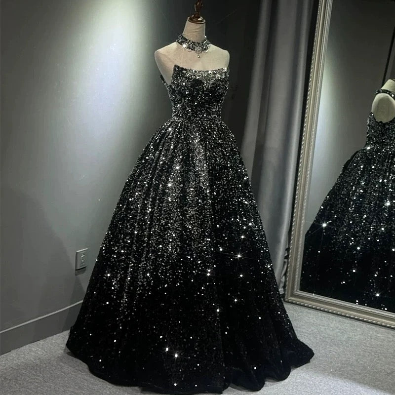 Pretty Ball Gown Strapless Black Sequin Prom Dresses Evening Dress P2463