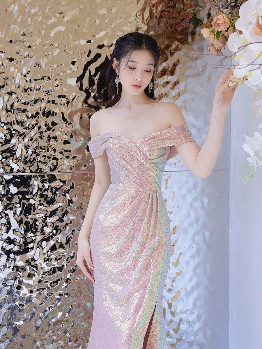 Pretty Mermaid Off The Shoulder Pink Sequin Long Evening Dress Prom Dresses SD2782