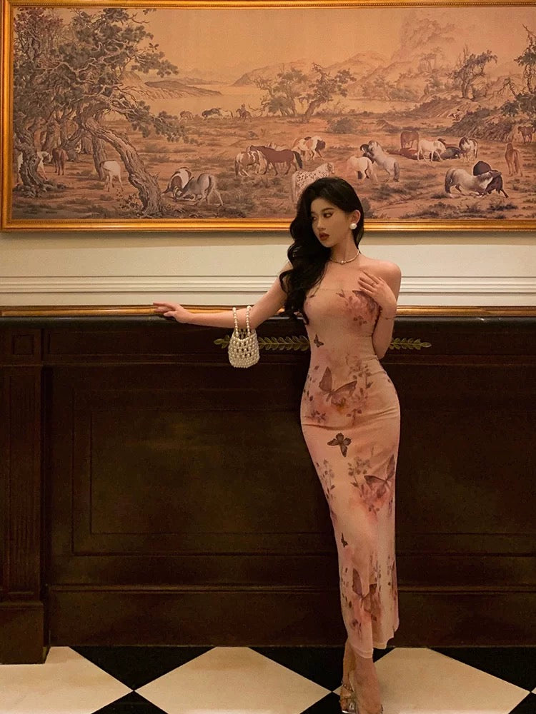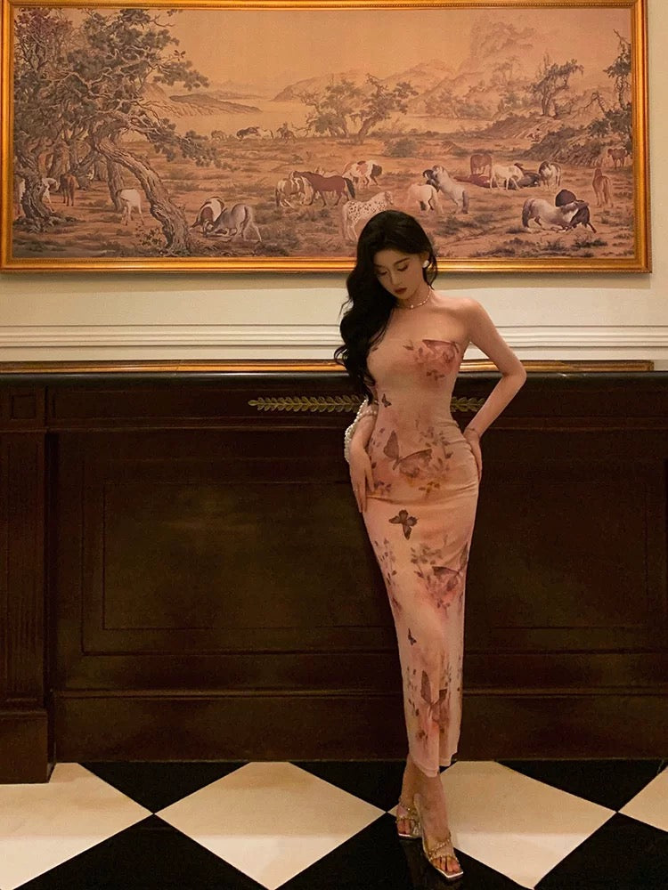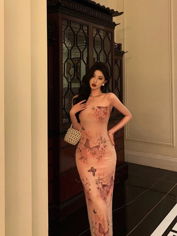 Pretty Sheath Strapless Pink Floral Date Night Dress Prom Dresses Birthday Party Outfit SD906