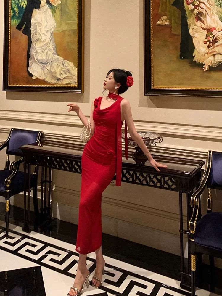 Pretty Sheath Straps Sleeveless Floral Date Night Dress Red Prom Dresses Birthday Outfits SD715