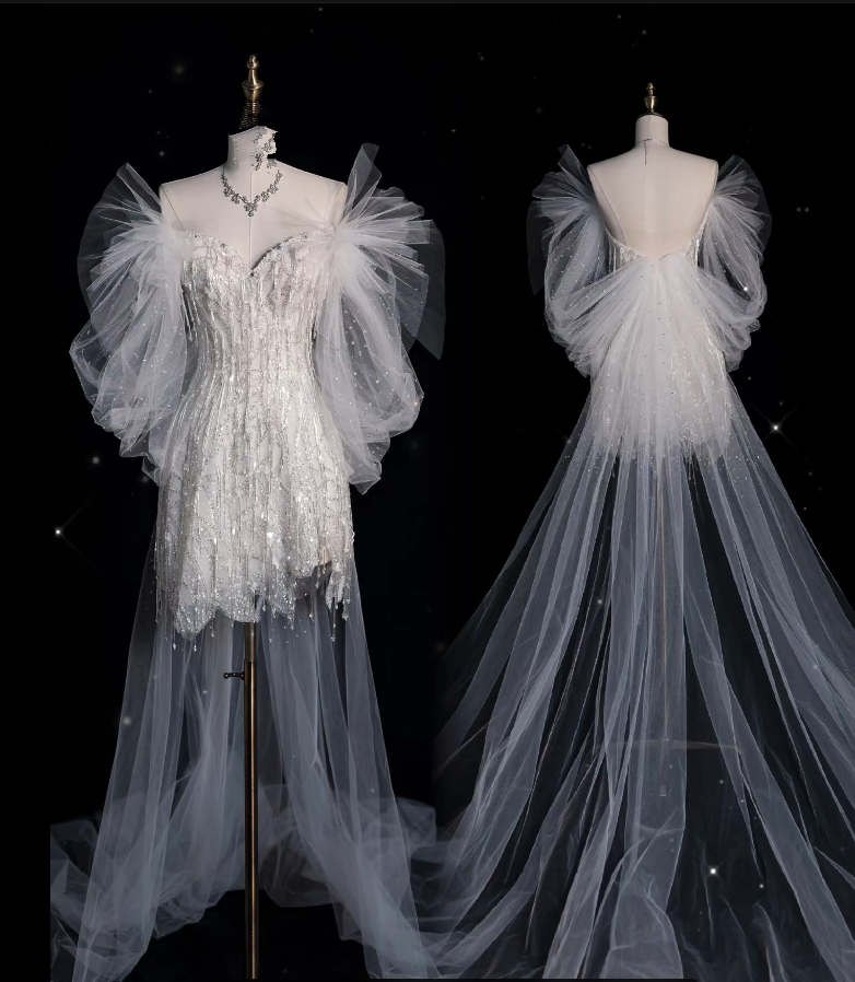 Trends: Modern, BlackSilhouette: Ball GownHemline / Train: Court TrainNeckline: Off ShoulderFabric: Tulle, LaceClosure: Lace UpSleeve Length: Short SleeveWaistline: NaturalFully Lined: YesEmbellishment: Cascading Ruffles, LaceBuilt-In Bra: YesBoning: YesWedding Venues: Garden / Outdoor, Hall, ChurchTheme: SexyWrap: No