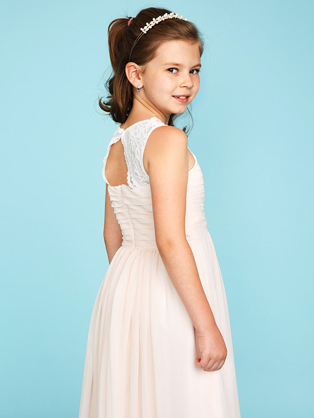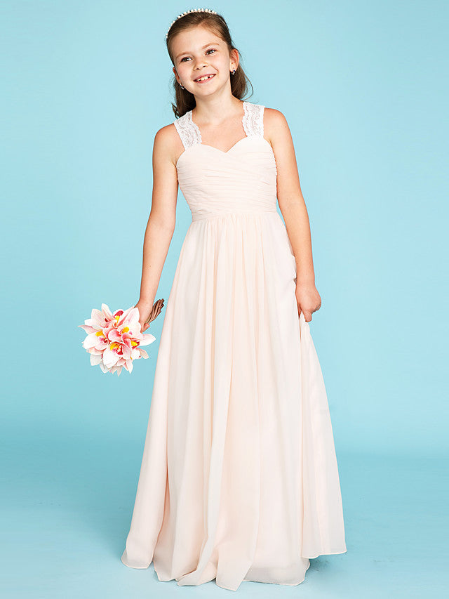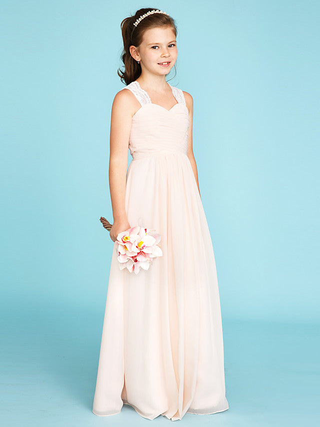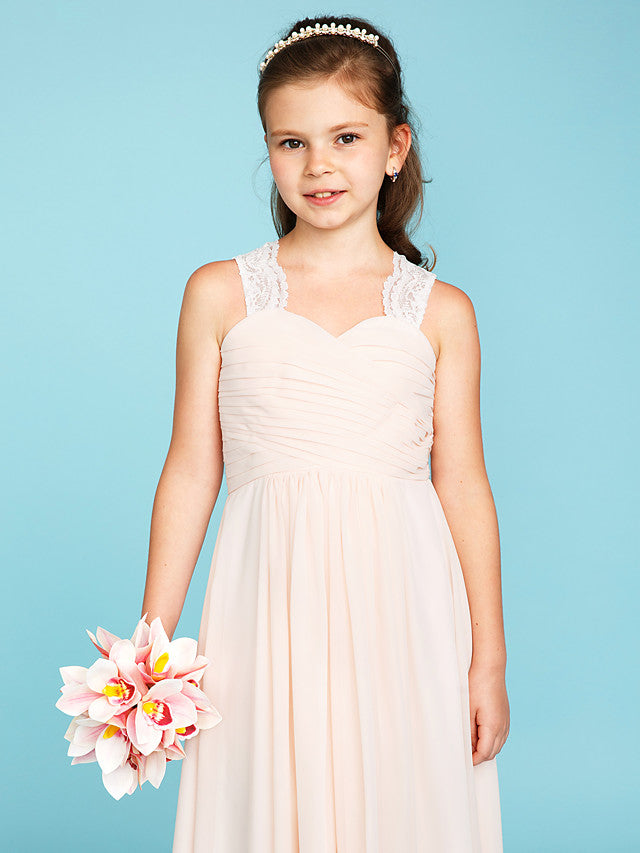 Princess A-Line Strap Floor Length Chiffon Lace Junior Bridesmaid Dress With Ruched Side-Draped for Wedding Party