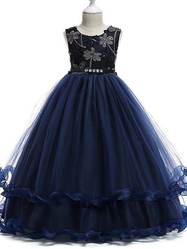 Princess Round Neck Floor Length Flower Girl Dress with Bow Crystals Appliques