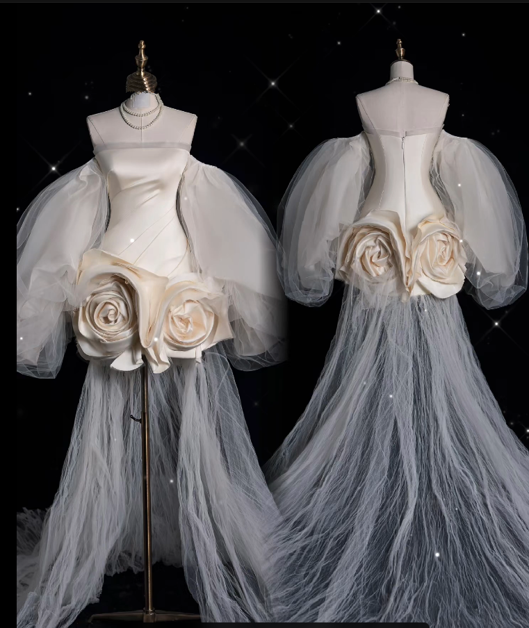 Trends: Modern, BlackSilhouette: Ball GownHemline / Train: Court TrainNeckline: Off ShoulderFabric: Tulle, LaceClosure: Lace UpSleeve Length: Short SleeveWaistline: NaturalFully Lined: YesEmbellishment: Cascading Ruffles, LaceBuilt-In Bra: YesBoning: YesWedding Venues: Garden / Outdoor, Hall, ChurchTheme: SexyWrap: No