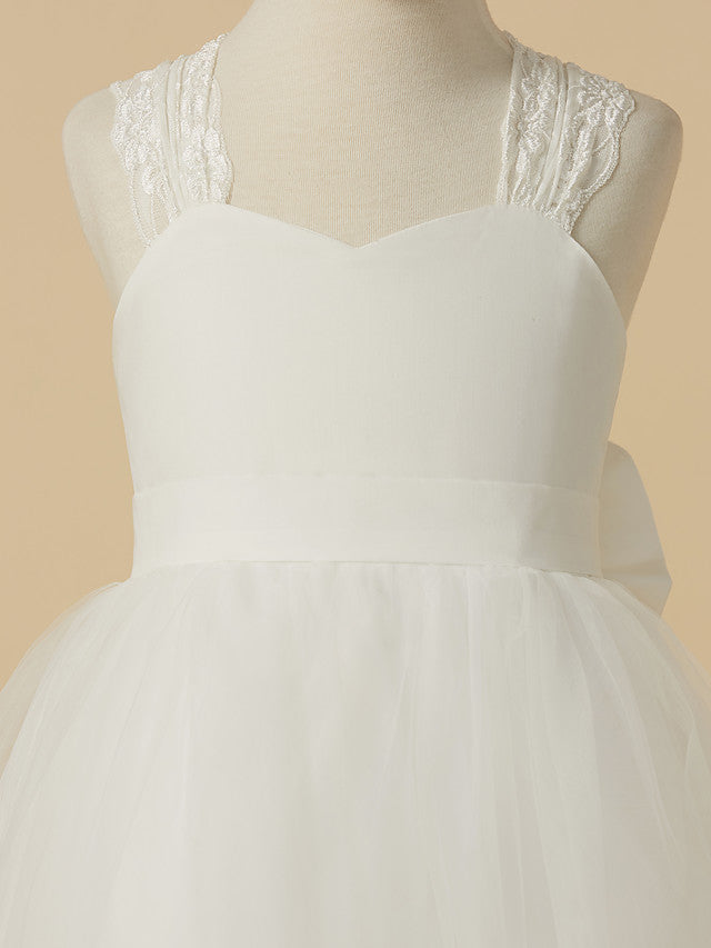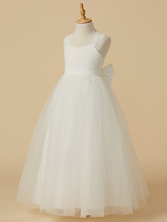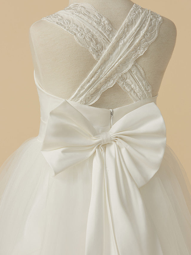Princess Sleeveless Halter Neck Floor Length Flower Girl Dress with Lace Satin Tulle and Bow