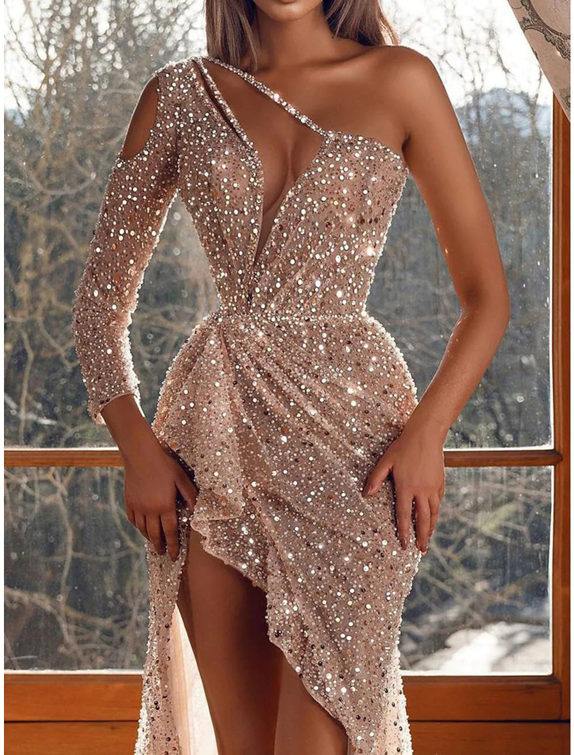 Prom Dresses Sexy Dress Formal Evening Long Sleeve One Shoulder Sequined with