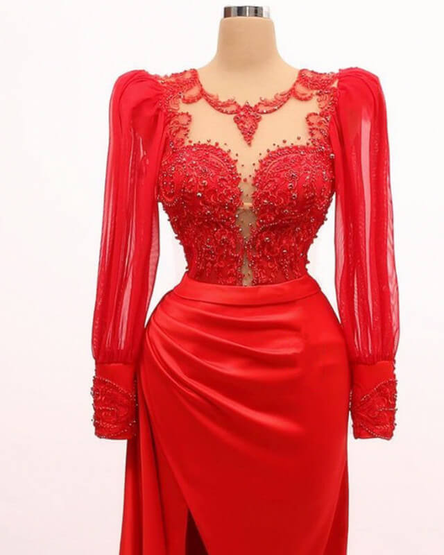 Classy Long sleeve mermaid dress with high slit , lace appliques with sheer neckline.