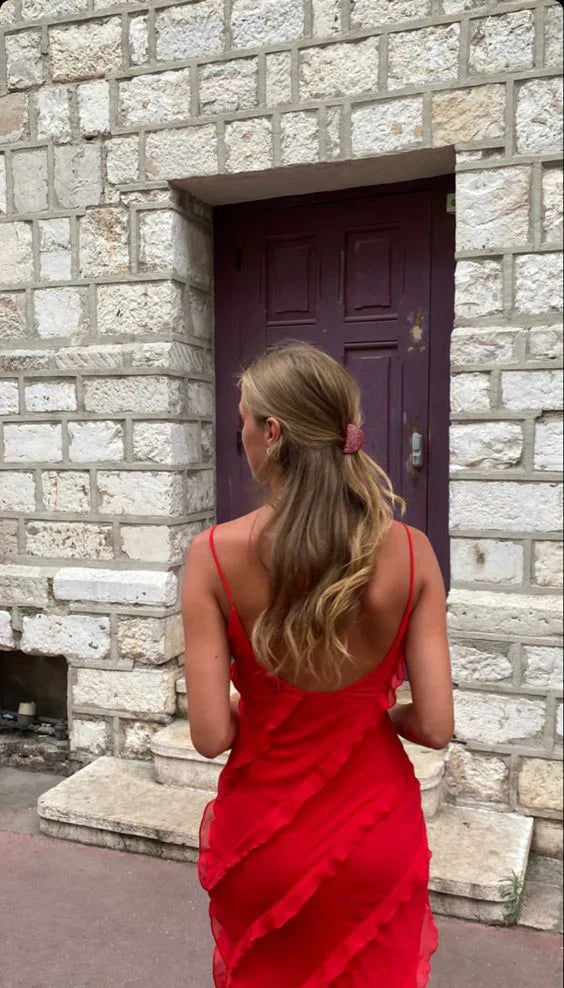 Red Spaghetti Straps Ruffle Mermaid Long Party Dress Wedding Guest Dress