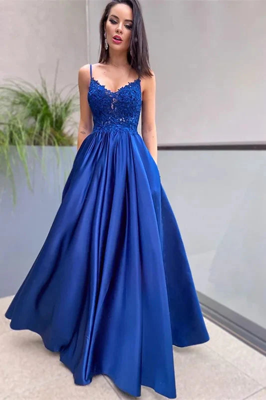Royal Blue Spaghetti-Straps Evening Dress Lace Appliques With Pockets