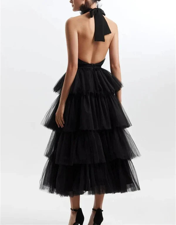 Ruffle Layered tulle Hem Haltered A-line tutu French style long prom dress