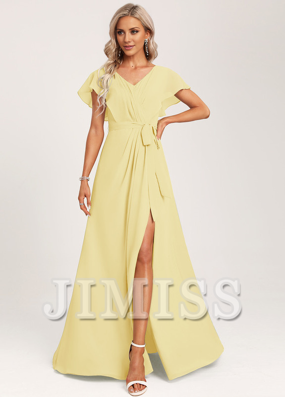 Ruffled A-line V-neck Floor-length Chiffon Bridesmaids Dress