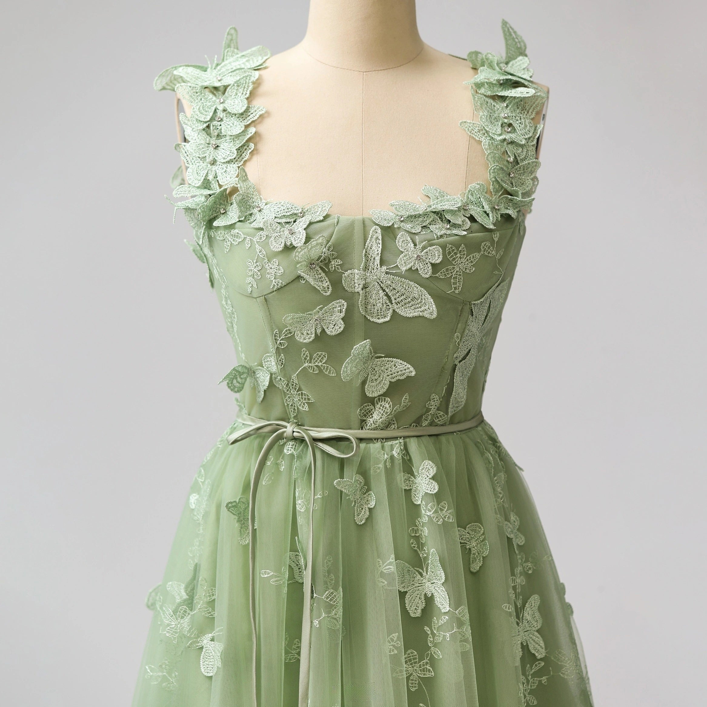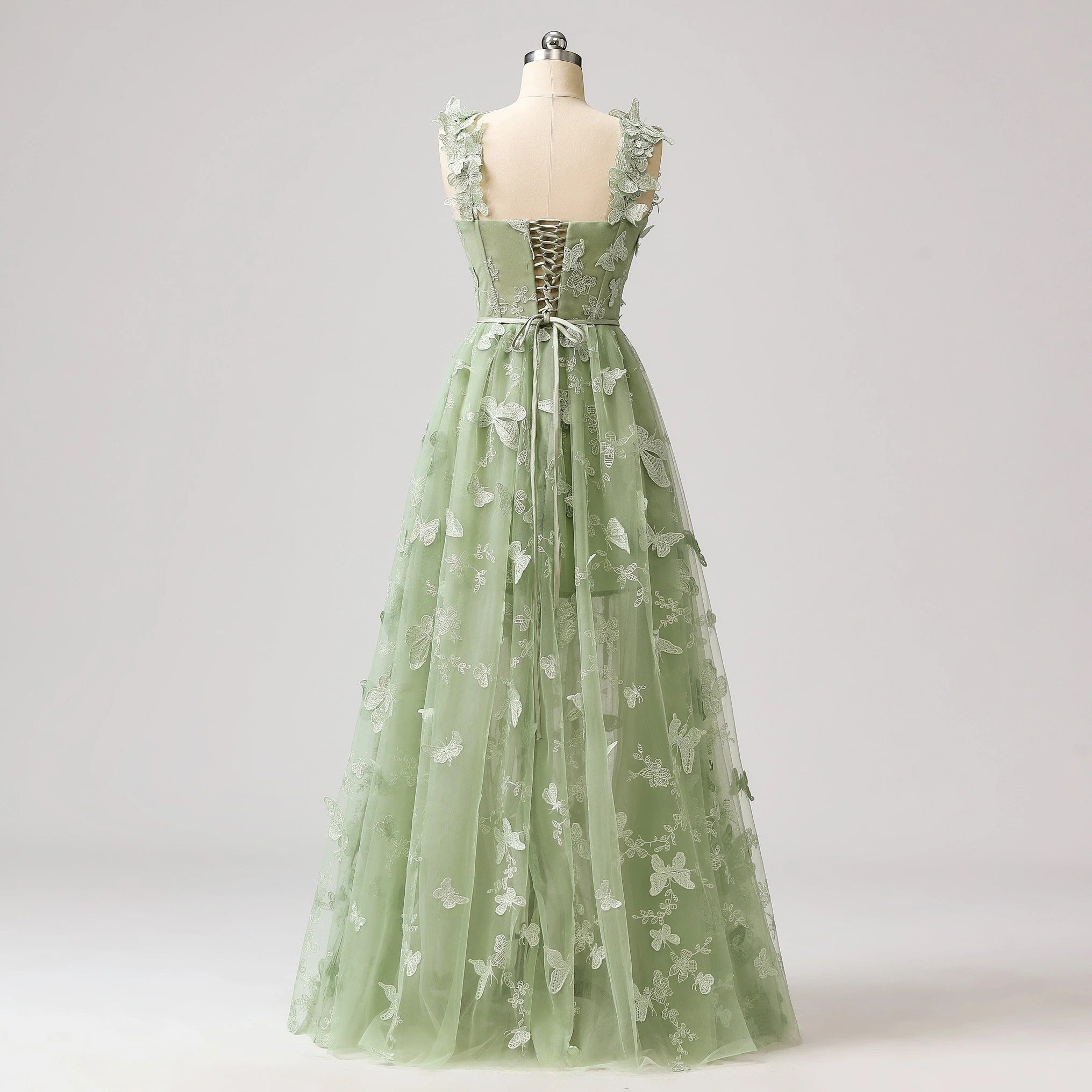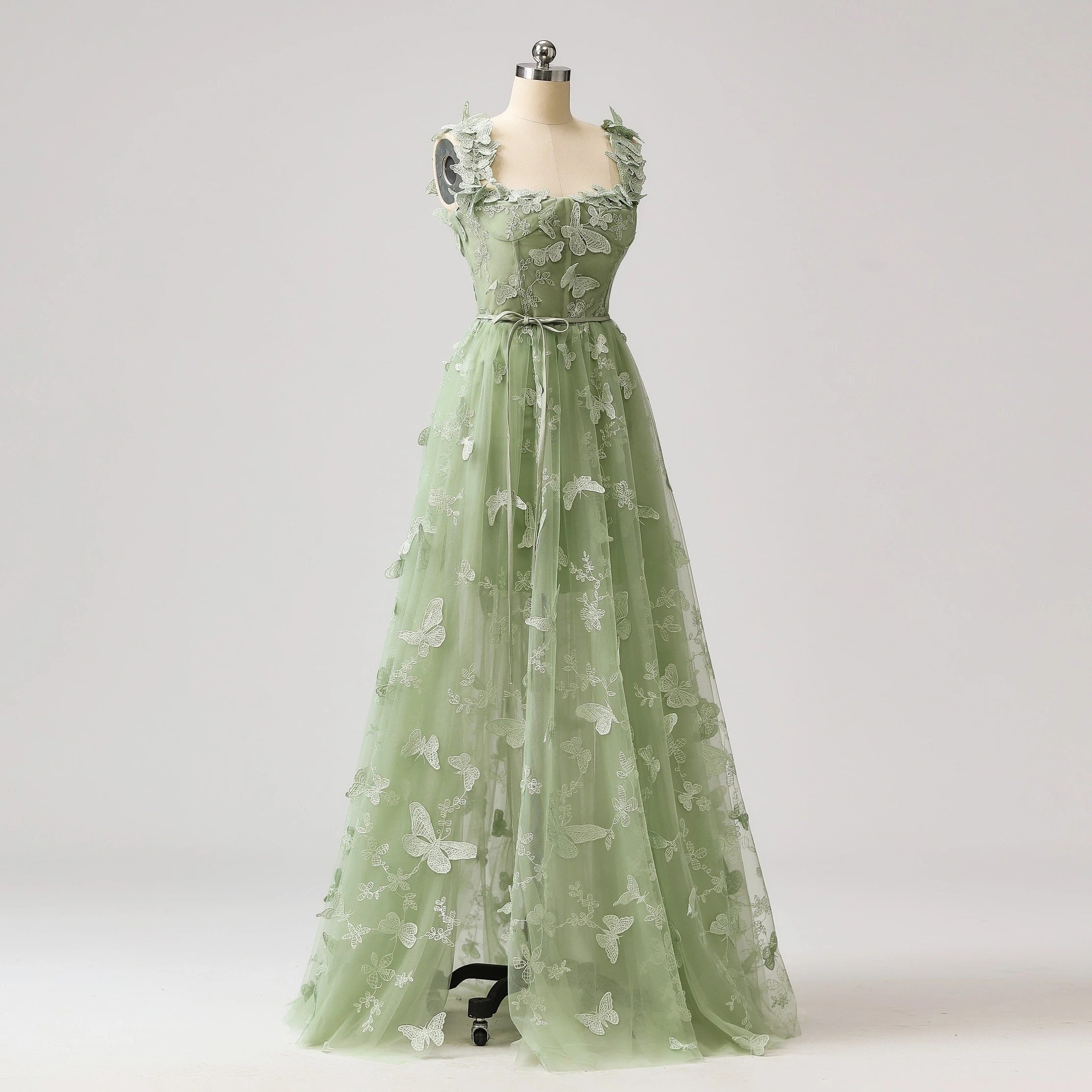 Sage Green A-Line Tulle Spaghetti Straps 3D Butterfly Long Prom Dress Sweet Adult Graduation Prom Dress ED01518