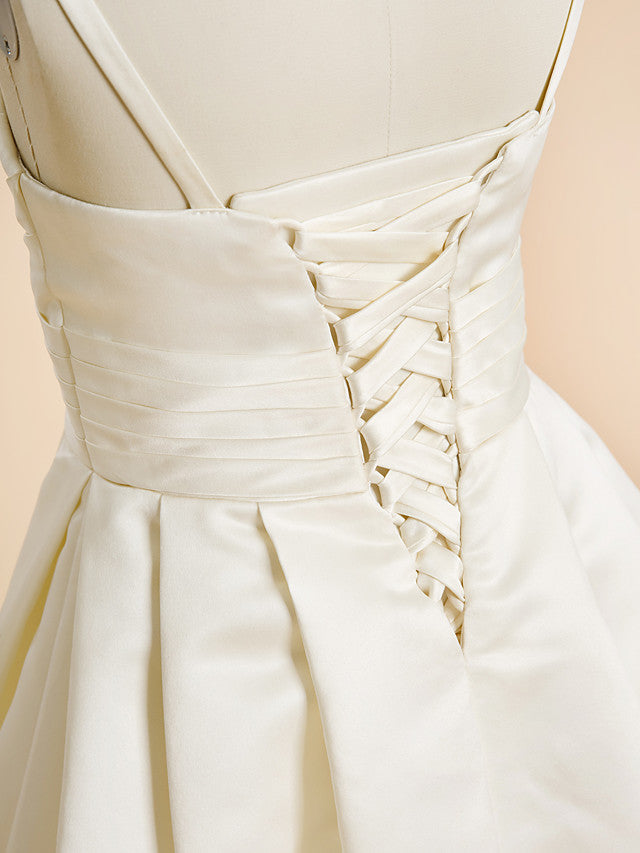 Style: Simple Neckline: V-neck Sleeve Length(cm): Short Wedding Dress Fabric: Satin Train: Chapel Train Origin: CN(Origin) For Pregnant Women: Yes Dresses Length: Floor-Length Back Design: Backless Item Type: Wedding Dresses Sleeve Style: Regular Built-in Bra: Yes is_customized: Yes Decoration: Pleat Fashion Element: simple Waistline: Natural Factors Silhouette: Ball Gown