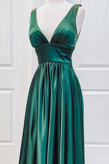 Satin Deep V Neck Empire Pleated Bridesmaid Dress