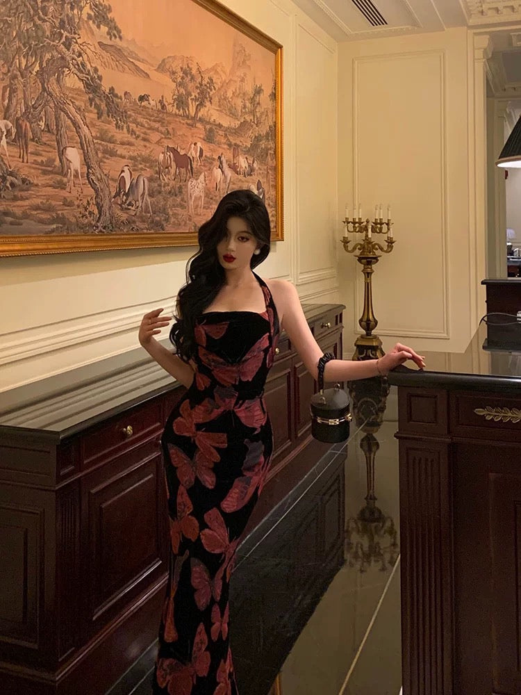 Sexy French Sheath Halter Floral Prom Dresses Birthday Outfits Evening Gown SD1041