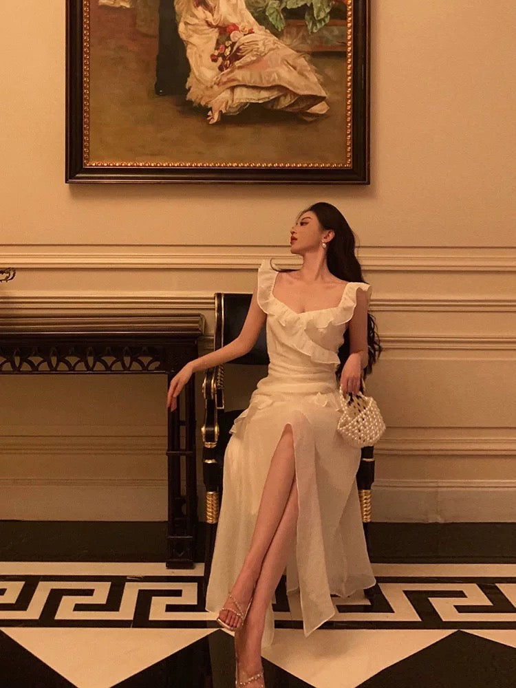 Sexy High Low Spaghetti Straps White Chiffon Ruffles Prom Dresses Birthday Outfits Evening Gown SD977