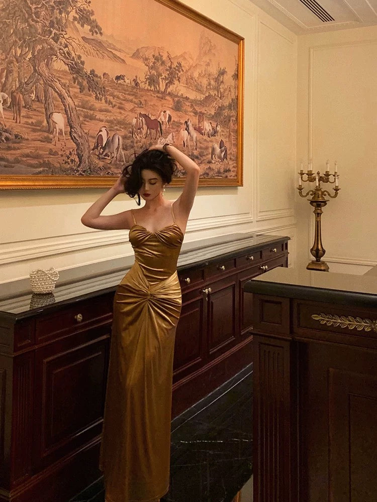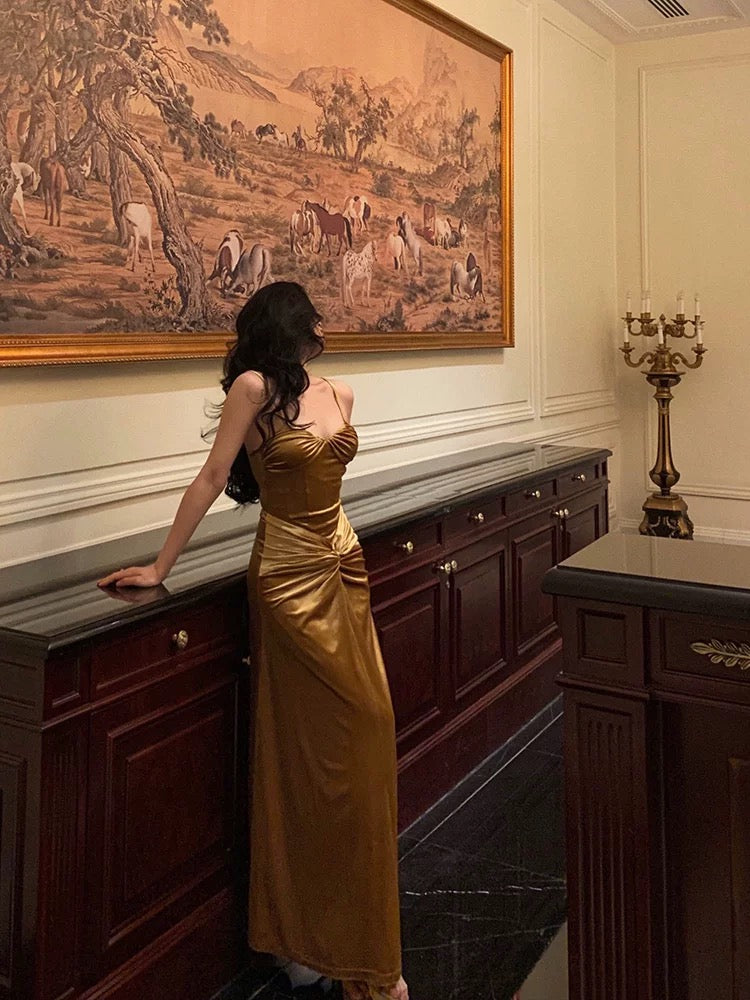 Sexy Mermaid Spaghetti Straps Gold Velvet Long Prom Dresses Birthday Outfits SD302