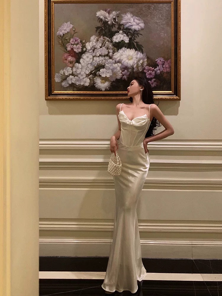 Sexy Mermaid Spaghetti Straps White Silk Satin Long Prom Dresses Birthday Outfits SD305