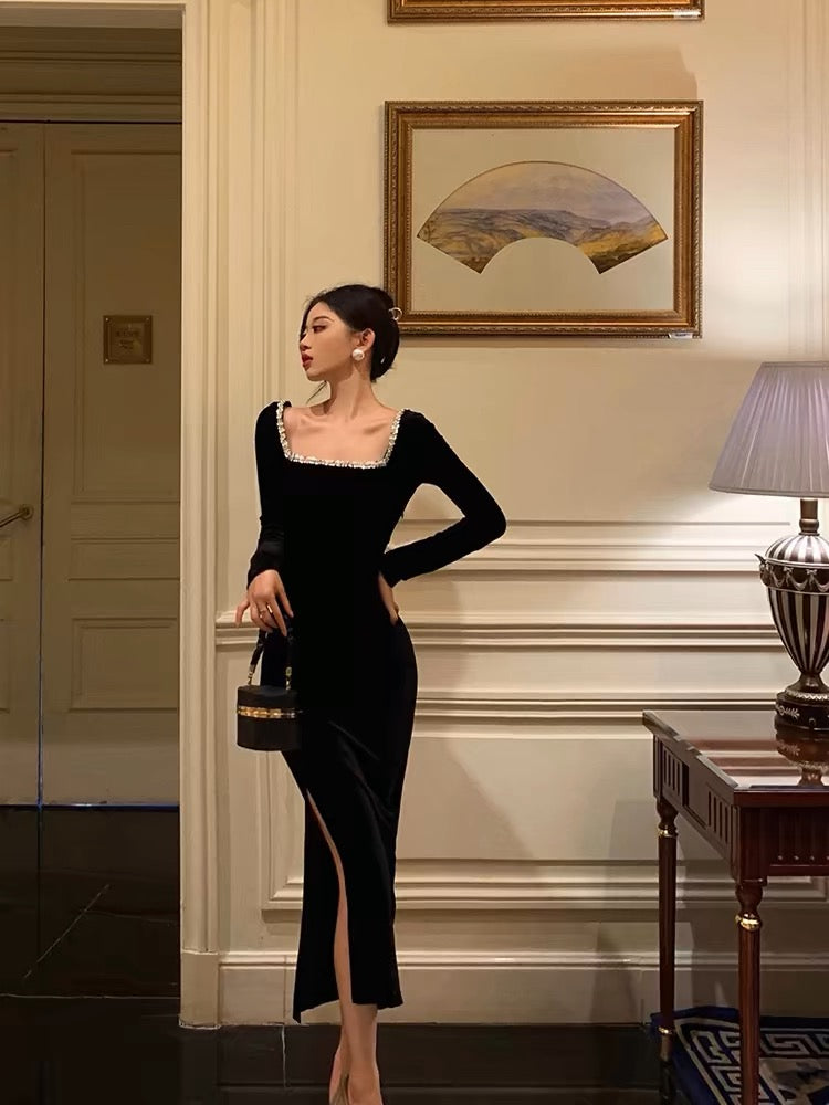Sexy Mermaid Square Neckline Black Velvet Slit Prom Dresses Birthday Outfits SD614