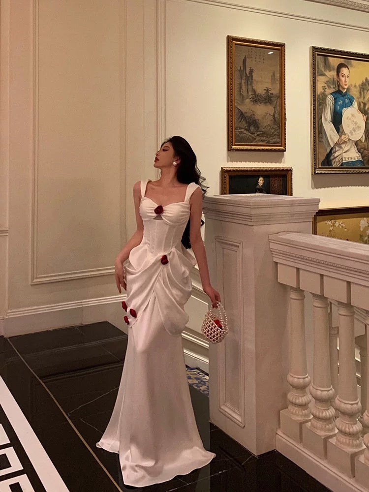 Sexy Mermaid Straps White Long Satin Prom Dresses Birthday Outfits SD594