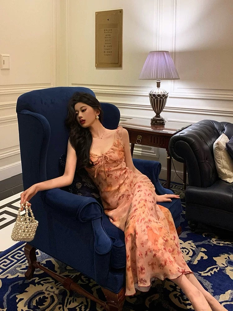 Sexy Sheath Straps Pink Floral Chiffon Ruffles Prom Dresses Birthday Outfits Evening Gown SD967