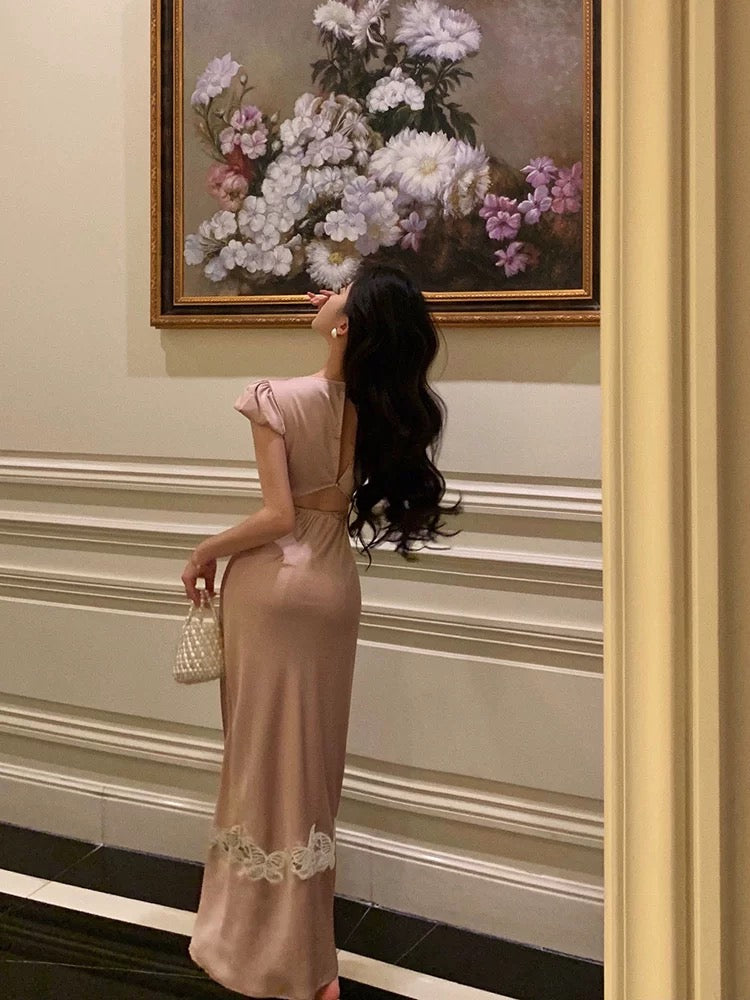 Pink Sweetheart Short Sleeves Long A-line Prom Dress, Pink Evening Gowns - Pink