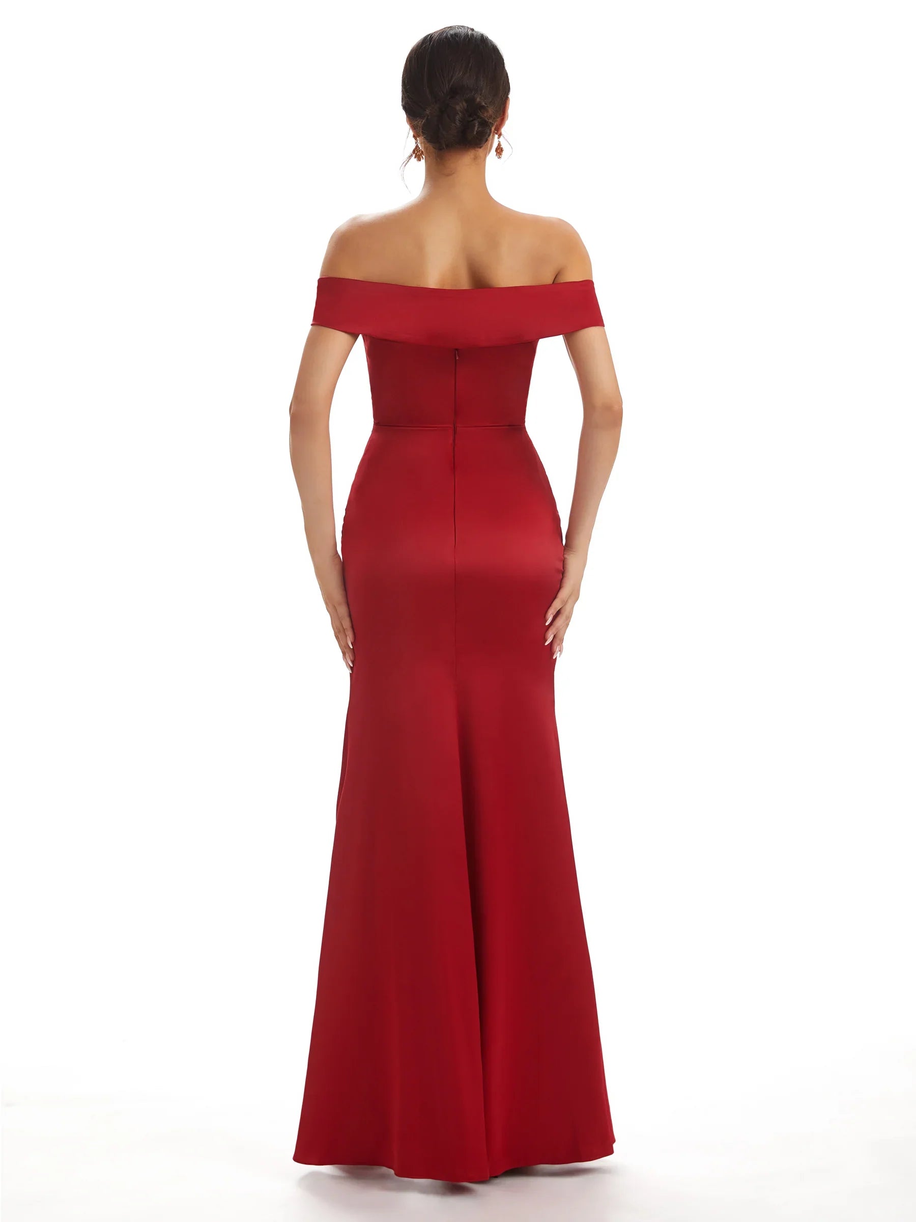 Sexy side slit shoulder fishtail soft satin bridesmaid dress