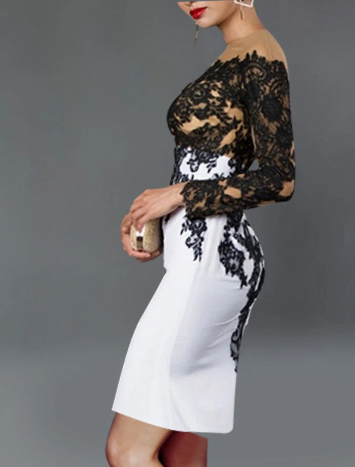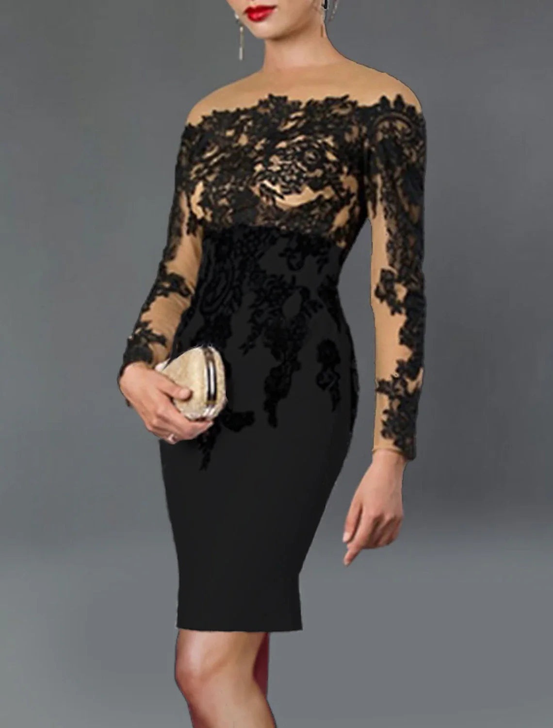 Sheath / Column Cocktail Black Dress Plus Size Elegant Dress Fall Wedding Guest Dress For Mother ColorBlock Tea Length Long Sleeve Off Shoulder Stretch Crepe with Appliques