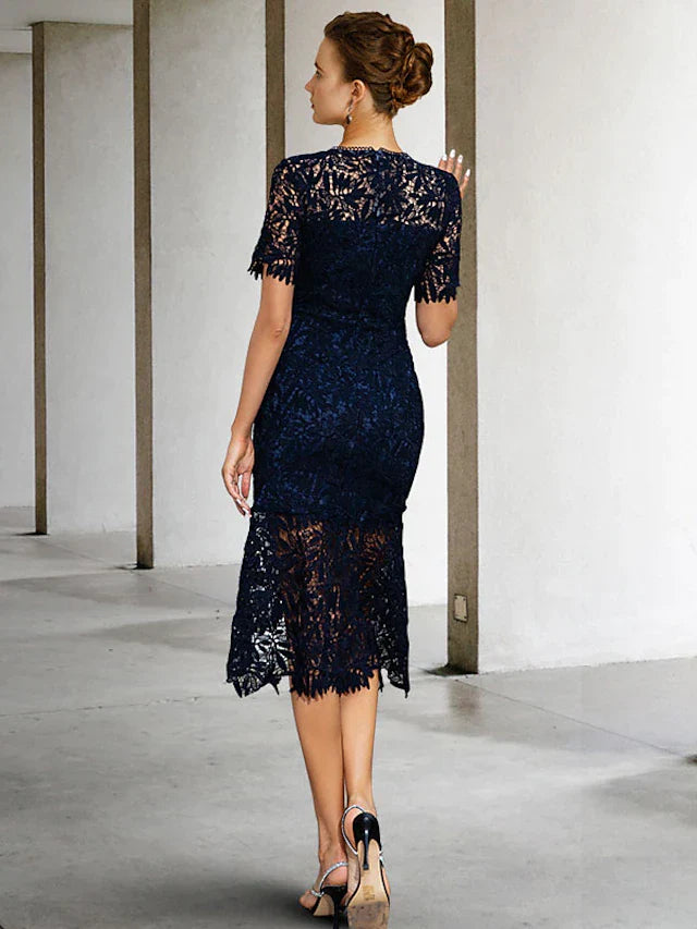 Sheath / Column Mother of the Bride Dress Simple Elegant High Low Jewel Neck Knee Length Lace Short Sleeve with Appliques Solid Color