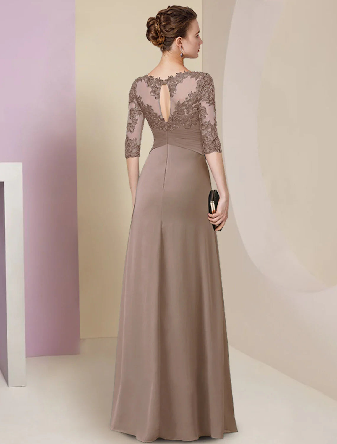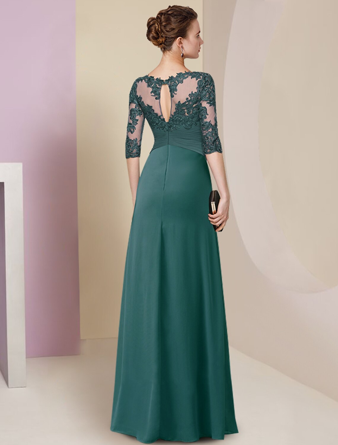 Sheath / Column Mother of the Bride Dress Simple Elegant Jewel Neck Floor Length Chiffon Lace Half Sleeve with Pleats Solid Color
