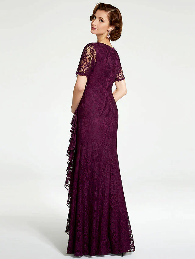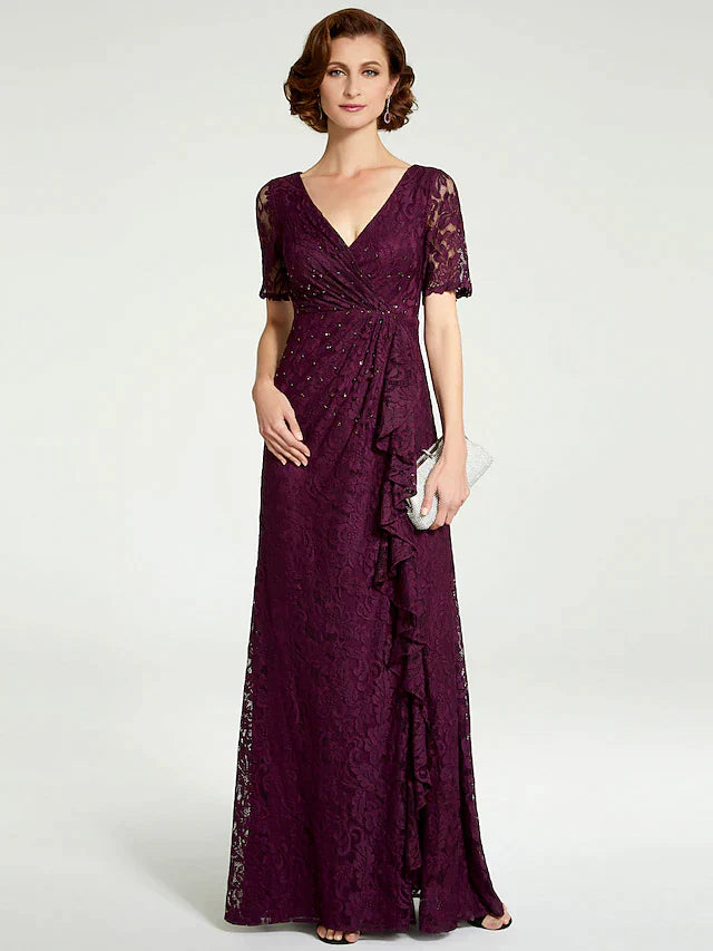 Sheath / Column Mother of the Bride Dress V Neck Floor Length Lace Short Sleeve with Lace Beading