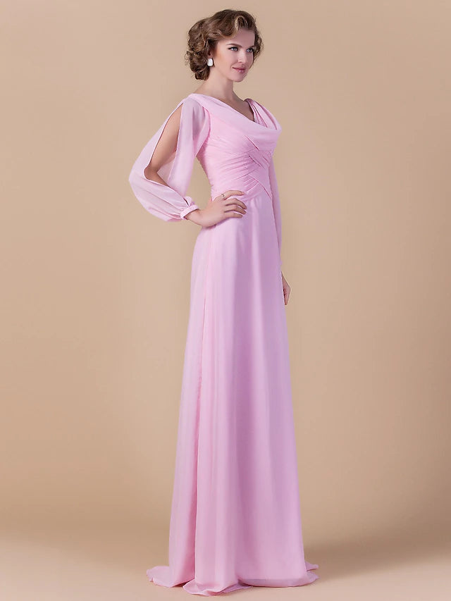 Sheath / Column Mother of the Bride Dress Vintage Inspired Cowl Neck Floor Length Chiffon Long Sleeve with Criss Cross Ruched