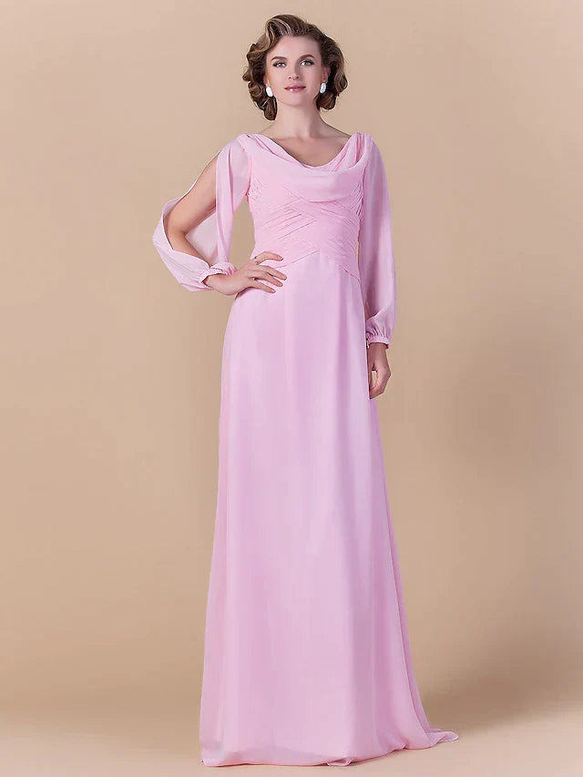 Sheath / Column Mother of the Bride Dress Vintage Inspired Cowl Neck Floor Length Chiffon Long Sleeve with Criss Cross Ruched