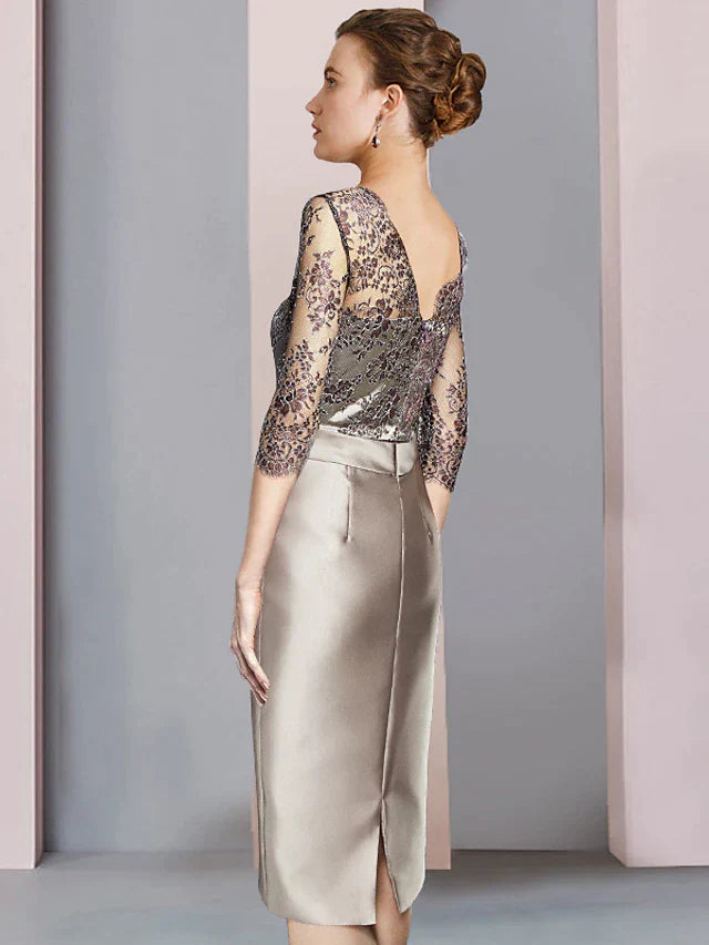 Sheath / Column Mother of the Bride Dress Wedding Guest Elegant Square Neck Knee Length Satin Lace Half Sleeve with Bow(s) Ruching
