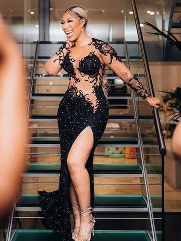 Sheath/Column Velvet Sequins Lace Scoop Long Sleeves Chapel Train Dresses