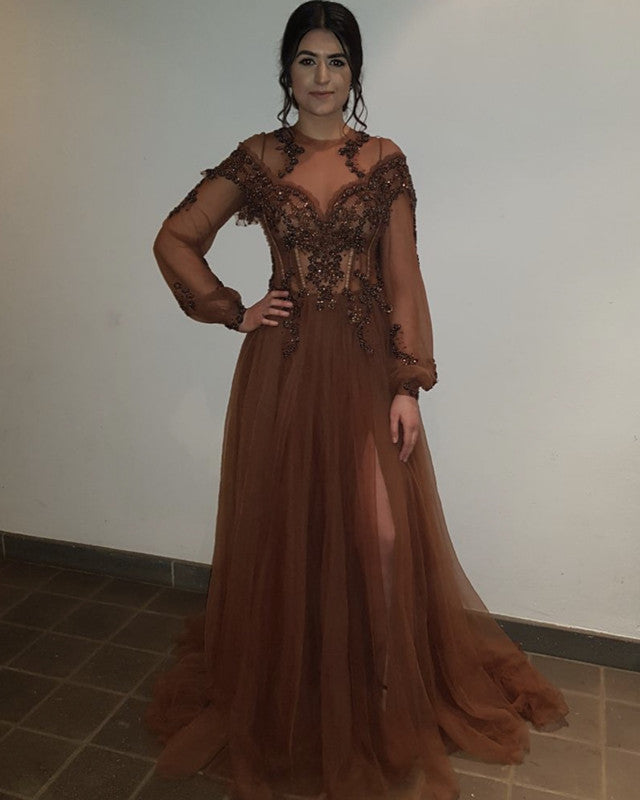Item Descriptions: Classic A-Line Long Sleeves Tulle Formal Dress with Scoop Neckline And Sheer Top,Leg Split.Perfect as your Prom,Evening,Formal or any other special occasion dresses!