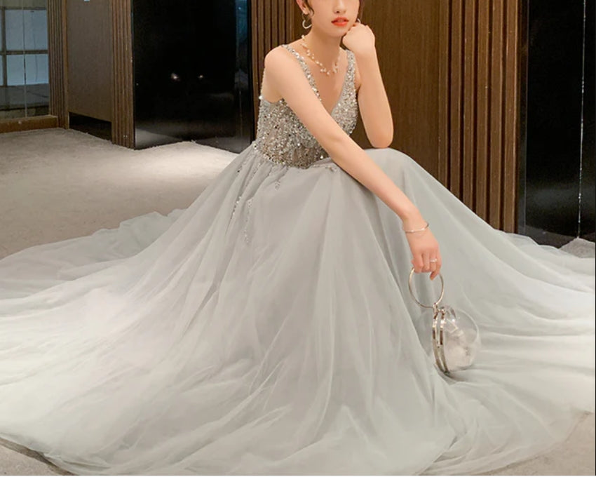 Shiny Beaded V Back Tulle Long Prom Dress Charming Tulle Party Dress