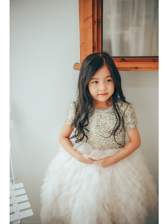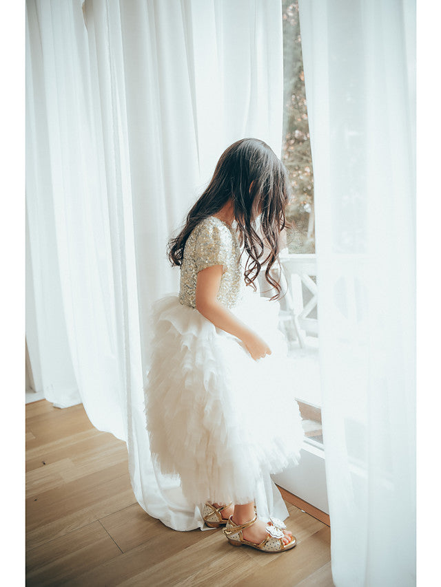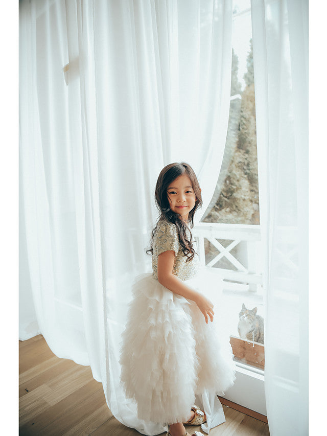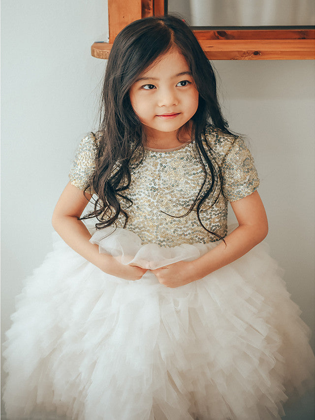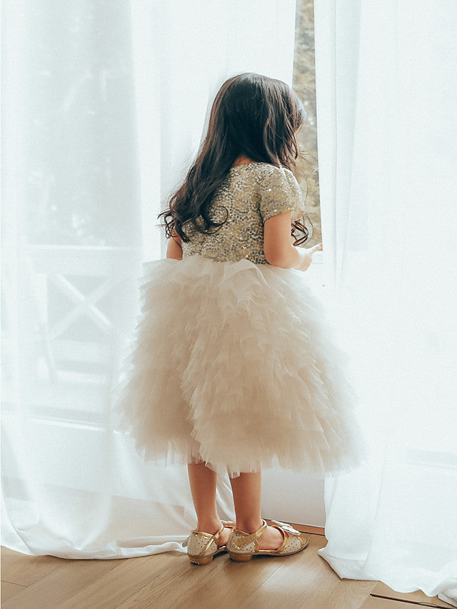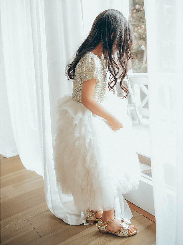 Short Sleeve Jewel Neck Flower Girl Dresses with Tulle & Paillette Sequins