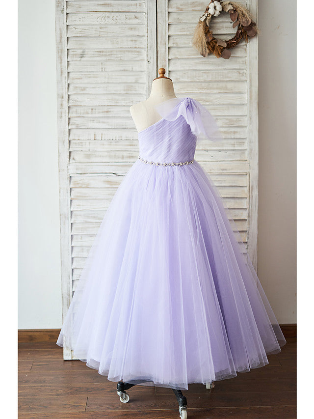 Sleeveless One Shoulder Ball Gown Flower Girl Dress With Belt Bow & Tulle
