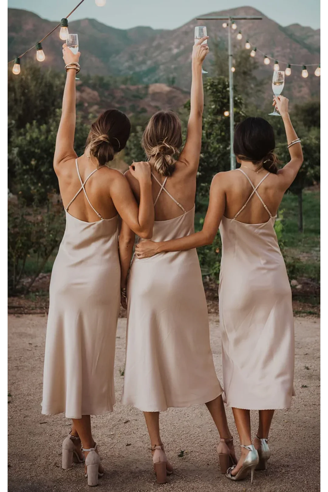 Spaghetti Strap Backless Sheath Tea Length Sleeveless Sexy Bridesmaid Dresses