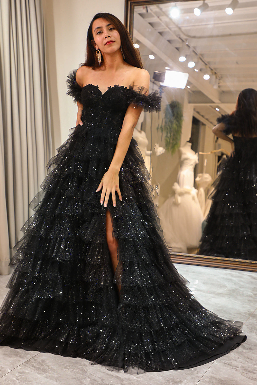 Sparkly Black A Line Long Corset Tiered Tulle Prom Dress With Slit